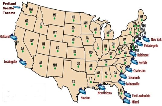 8. Below are if you are importing/exporting from Asia to U.S.: (Days it will take From most of Asia Sea Port to US Sea Port) Port of Long Beach/ Los Angeles, California (13-15 days) Port of Oakland/ San Francisco, California (13-15 days) Port of Portland, Oregon (13-15 days) From most of Asia Sea Port to US Sea Ports: Port of New York/ New Jersey (28 to 30 days) Port of Wilmington, Delaware (28 to 30 days) Port of Boston, Massachusetts (28 to 30 days) Port of Baltimore, Maryland (28 to 30 days) Port of Norfolk, Virginia (28 to 30 days) Port of Wilmington, North Carolina (28 to 30 days) Port of Charleston, North Carolina (28 to 30 days) Port of Savannah, Georgia (28 to 30 days) Port of Jacksonville, Florida (28 to 30 days) Port of Miami, Florida (28 to 30 days) Port of Tampa, Florida (28 to 30 days) Port of New Orleans, Louisiana (28 to 30 days) Port of Houston, Texas (28 to 30 days) Port of Corpus Christi (28 to 30 days) Port of Anchorage, Alaska (45- to 50 days) Bridgeport, Connecticut (28 to 30 days) Portland, Maine (28 to 30 days) World-Wide Sea Freights. |